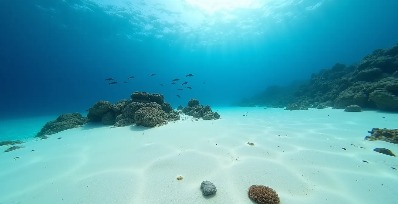 La force du site réside dans sa structure en trois actes. Comme le détaille un cas d’étude sur les sites d’apprentissage en Guadeloupe, Le Phare de la Baleine se compose de zones distinctes permettant une progression pédagogique remarquable en une seule plongée. L’exploration commence généralement sur de vastes étendues de sable fin. C’est le lieu idéal pour se concentrer sur l’exercice le plus crucial de la plongée : la maîtrise de la flottabilité. Sans obstacle, le plongeur peut ajuster son lestage et sa ventilation pour atteindre l’équilibre parfait, sans risquer d’endommager le corail.